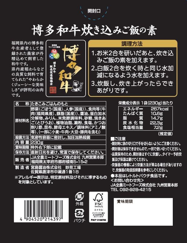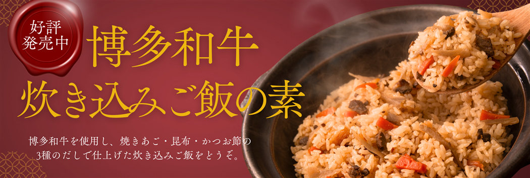 福岡県産の銘柄和牛「博多和牛」と3種のだしで仕上げた炊き込みご飯の素です。