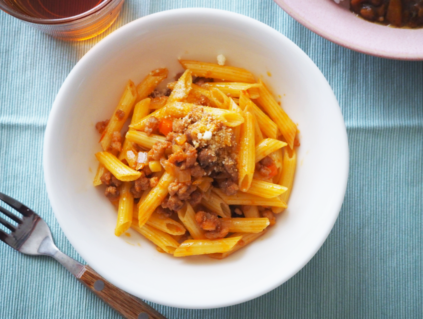楽さNo.1はパスタ! パスタソースを1から作るのももちろん良いですが、 フライパンでお肉と刻んだ玉ねぎを炒めて火が通ったら 市販のレトルトパスタソースを加えて混ぜ合わせるだけで 具材感とお肉のうま味がたっぷりのワンランク上のパスタに変身♪ トマト系のパスタソースはどれも相性抜群です。