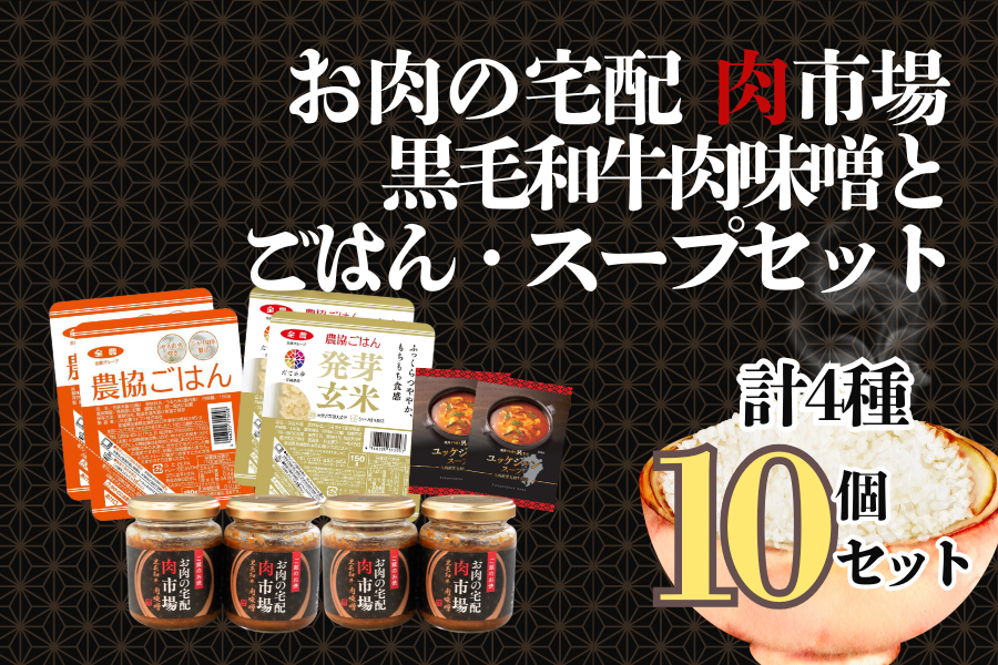 黒毛和牛を使用した”お肉の宅配肉市場オリジナル肉味噌”と 九州産黒毛和牛入りの焼肉すき焼き純監修ユッケジャンスープに 2種類のパックごはんをセットした詰め合わせセットです。 〜詰め合わせ内容〜 お肉の宅配肉市場 黒毛和牛肉味噌110g×4個 焼肉すき焼き純監修ユッケジャンスープ14.1g×2個 農協ごはん180g×2個 農協ごはん発芽玄米150g×2個