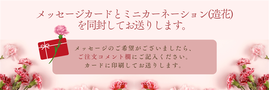 メッセージカードとミニカーネーション(造花)を同封してお送りします。