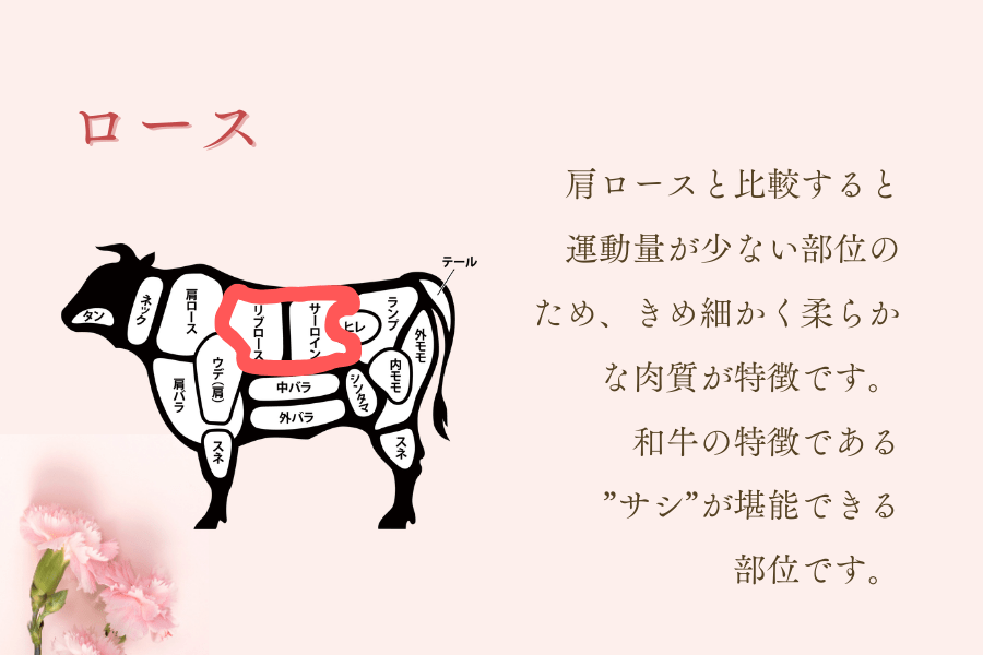 ロースは、肩ロースと比較すると運動量が少ない部位のため、きめ細かく柔らかな肉質が特徴です。和牛の特徴である”サシ”が堪能できる部位です。