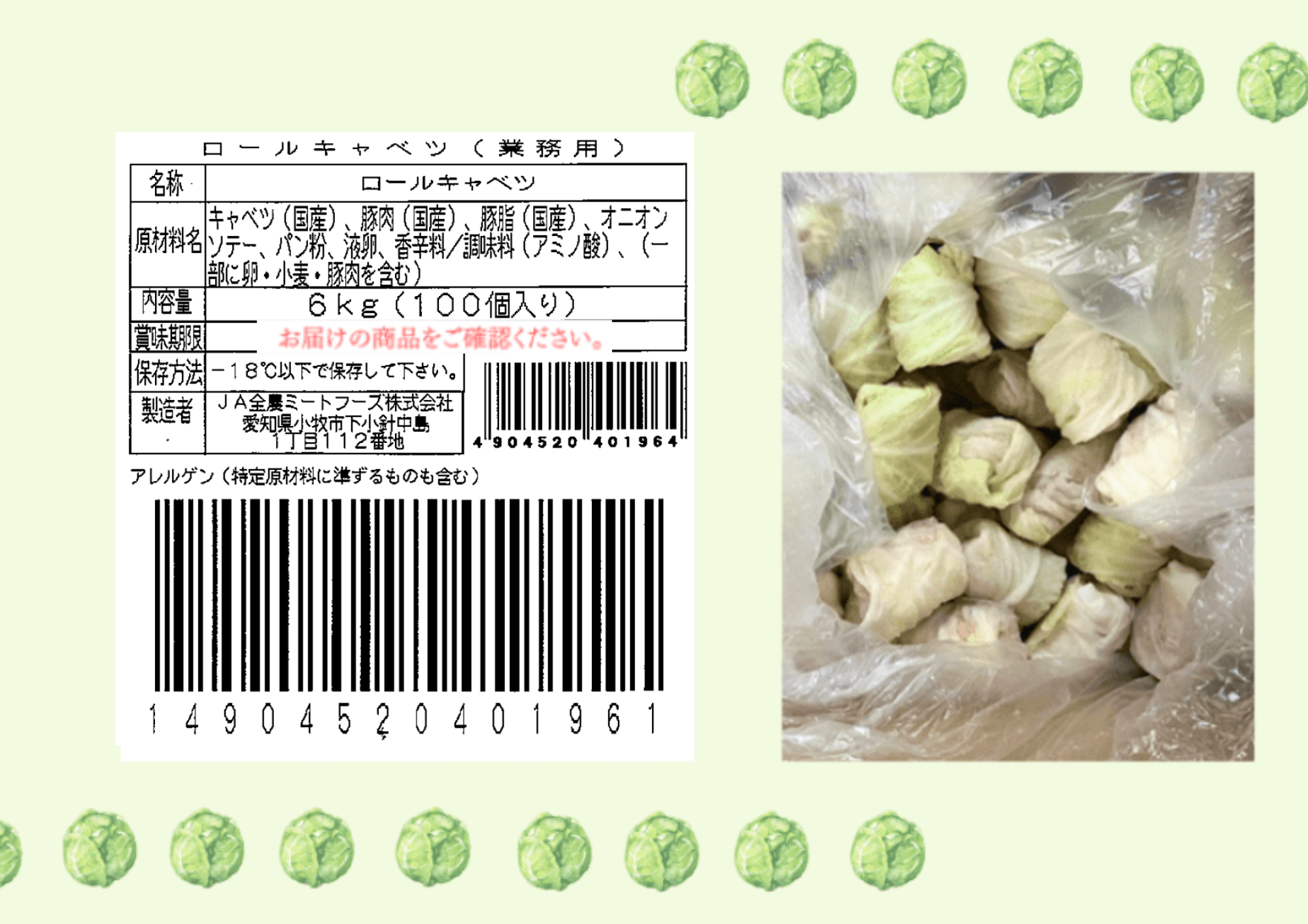 キャベツ(国産)、豚肉(国産)、豚脂(国産)、オニオンソテー、パン粉、液卵、香辛料/調味料(アミノ酸)、(一部に卵・小麦・豚肉を含む)