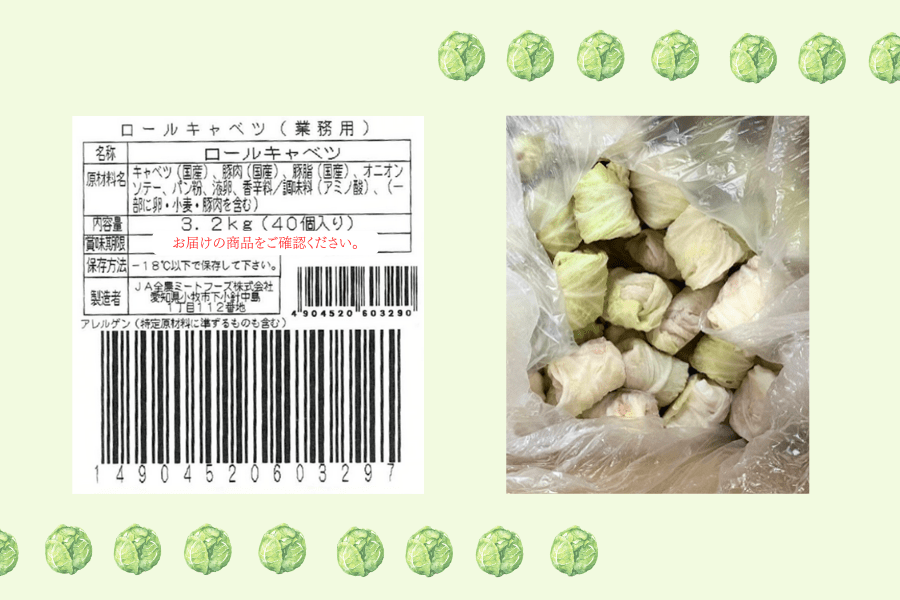 キャベツ(国産)、豚肉(国産)、豚脂(国産)、オニオンソテー、パン粉、液卵、香辛料/調味料(アミノ酸)、(一部に卵・小麦・豚肉を含む)