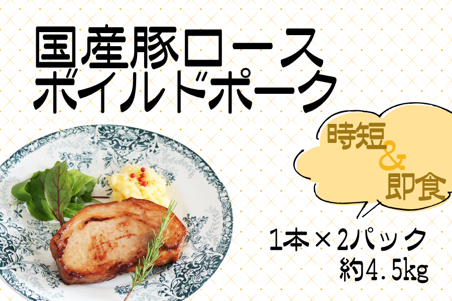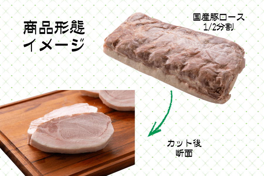 低温調理でしっとり柔らかく仕上げた国産豚のロースです。 ロースをハーフサイズにカットしてあります。 1ブロック約2kg。※不定貫 お好みの厚さにカットし様々な用途でご利用いただけます。 1パック1ブロック入りを計2パック(約4.5kg)でお届けします。