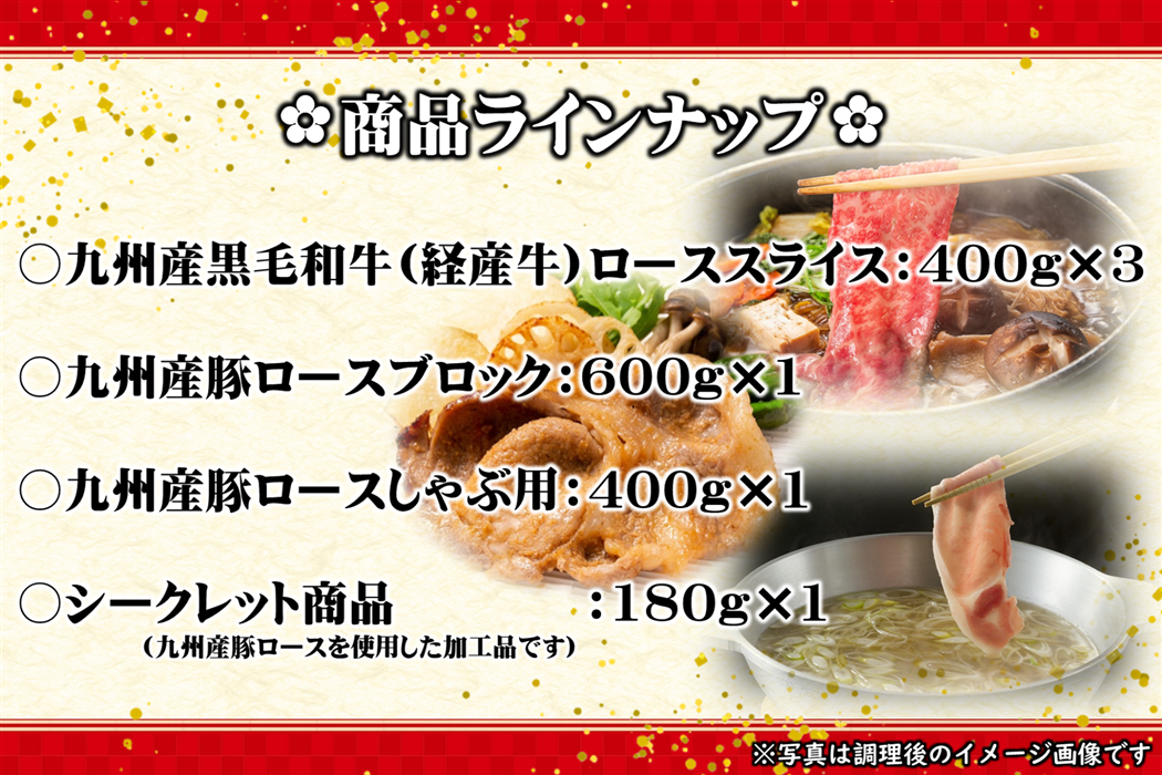 【福袋の内容】 九州産黒毛和牛(経産和牛)ローススライス:400g×3パック 九州産豚ロースブロック:600g×1パック 九州産豚ロースしゃぶしゃぶ用:400g×1パック シークレット商品:180g×1パック シークレット商品を含め全4品・6パックのとっても贅沢な福袋です!!総重量はなんと約2.4kg!!