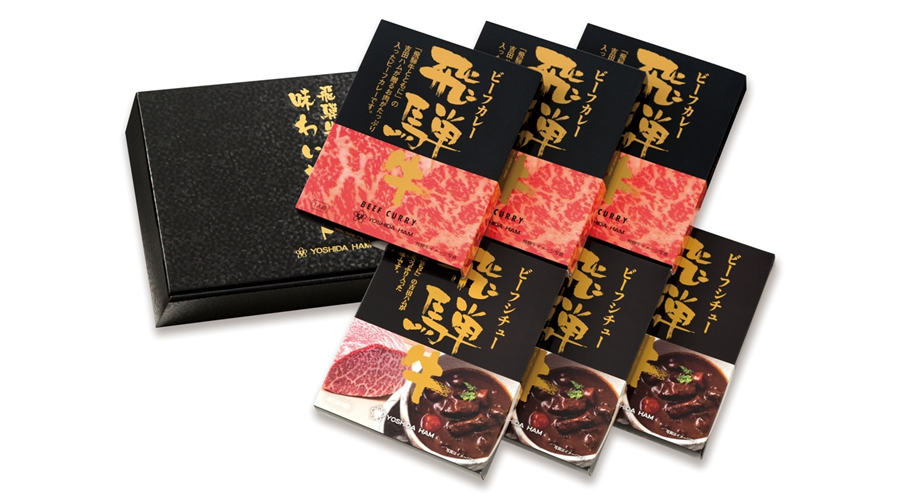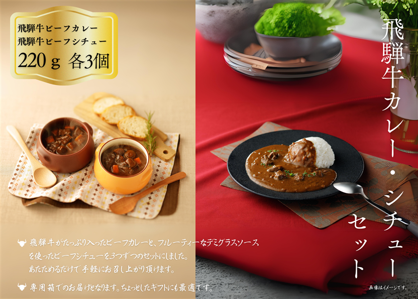 岐阜県の誇る銘柄牛である飛騨牛を贅沢に使ったビーフカレーとビーフシチューのギフト仕様商品です。 専用の化粧箱に梱包した3個ずつのセットになります。 ご自宅用に、ちょっとしたギフトやお礼におすすめです!