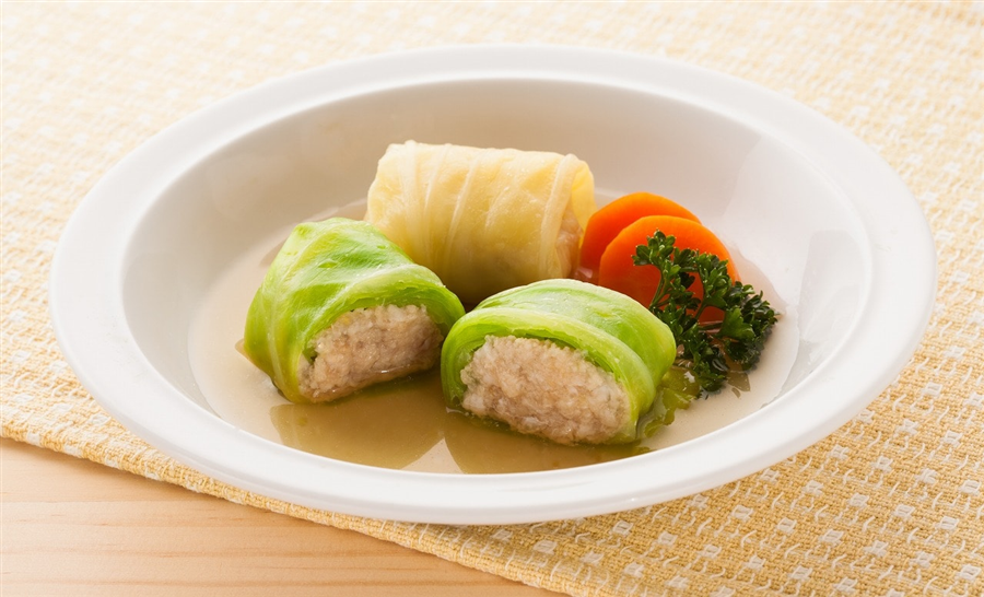 このロールキャベツは、ひとつひとつ手で巻いてつくっておりますので少々、ほどけやすくなっております。