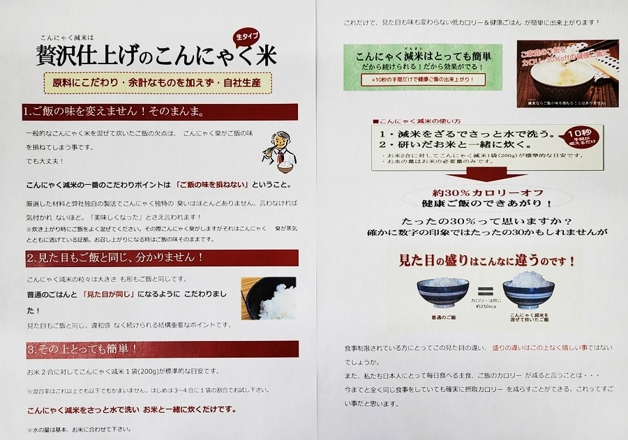 こんにゃく生産量日本一の群馬県の下仁田町にあるこんにゃく製品製造メーカー茂木食品で製造しているこんにゃく減米です。