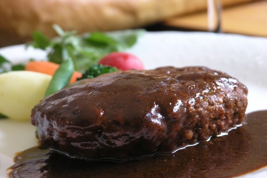 国産牛肉,国産豚肉の合挽きを使用。玉ねぎ,パン粉,玉子,塩,胡椒,をよく攪拌し最後にお肉を入れ、繊維を崩さぬようあまり練りこみまず、合わせる程度でお肉の食感を大切にしたハンバーグです。