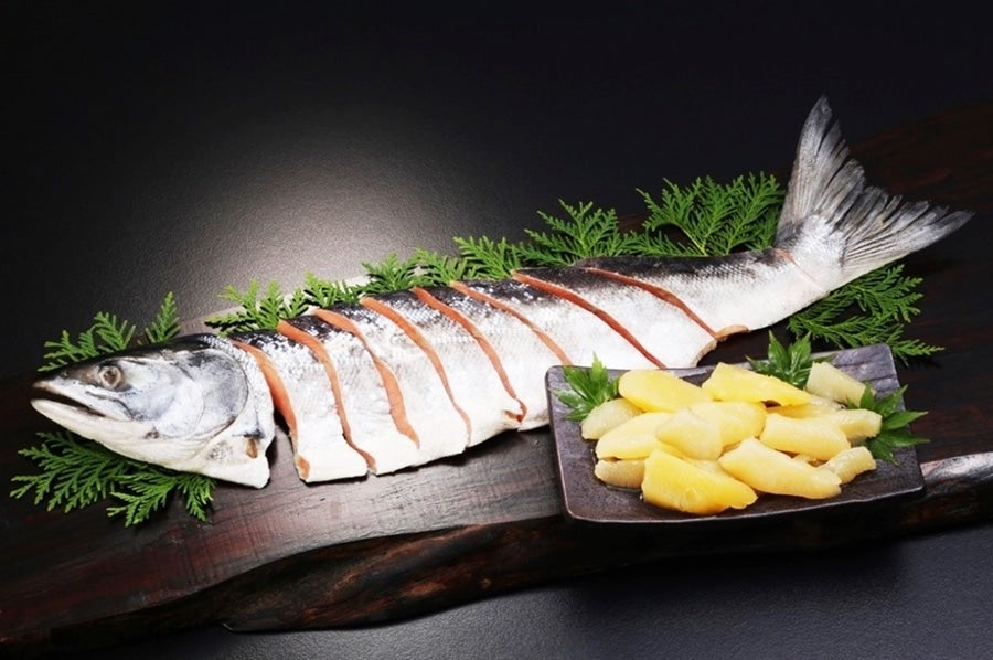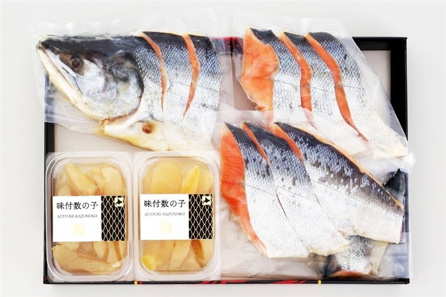 北海道産の秋鮭を塩蔵し、姿切身にした新巻鮭と数の子の豪華な詰合せ。