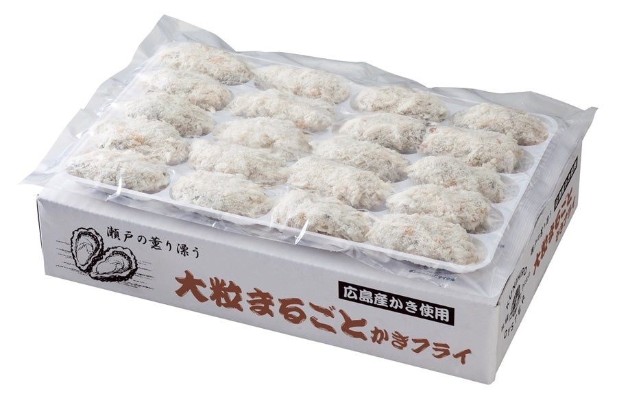 <原材料名>かき(広島県)、衣(パン粉、小麦粉、小麦粉加工品、ばれいしょでん粉、大豆たん白、食塩、ぶどう糖、粉末卵白)、(一部に小麦・卵・乳成分・大豆を含む)