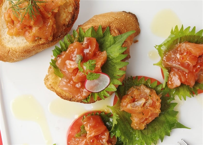 サーモンオリーブは、天然鮭を醤油とオリーブオイルで味付けし、和風でも洋風でも楽しめる生珍味。とろりとした口溶けが後を引くおいしさです。