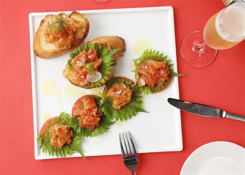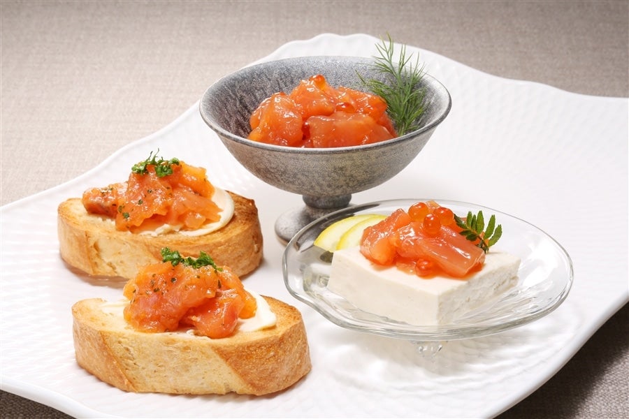 鮭ルイベ漬 輪切りのトマトに青じそと共に乗せるだけで、華やかなおつまみメニューに変身