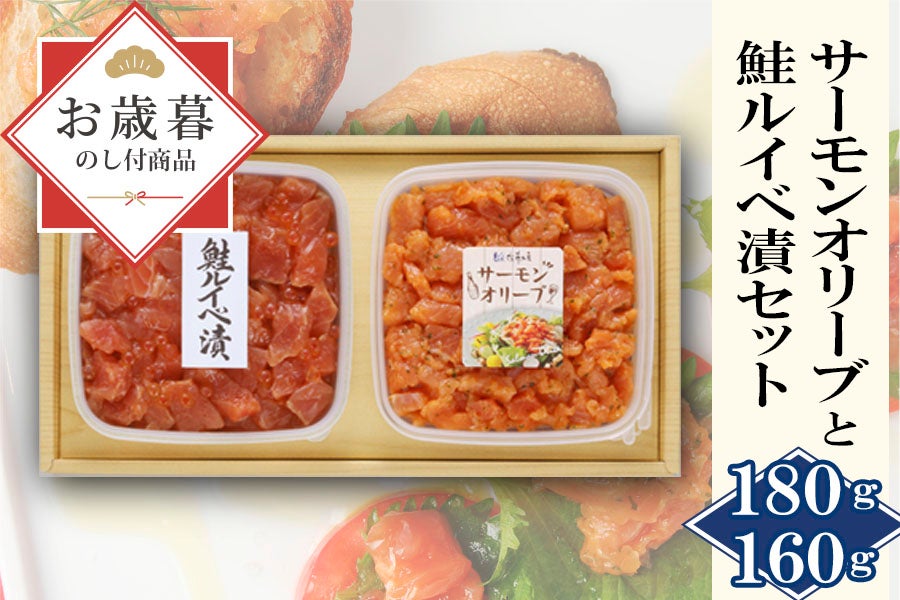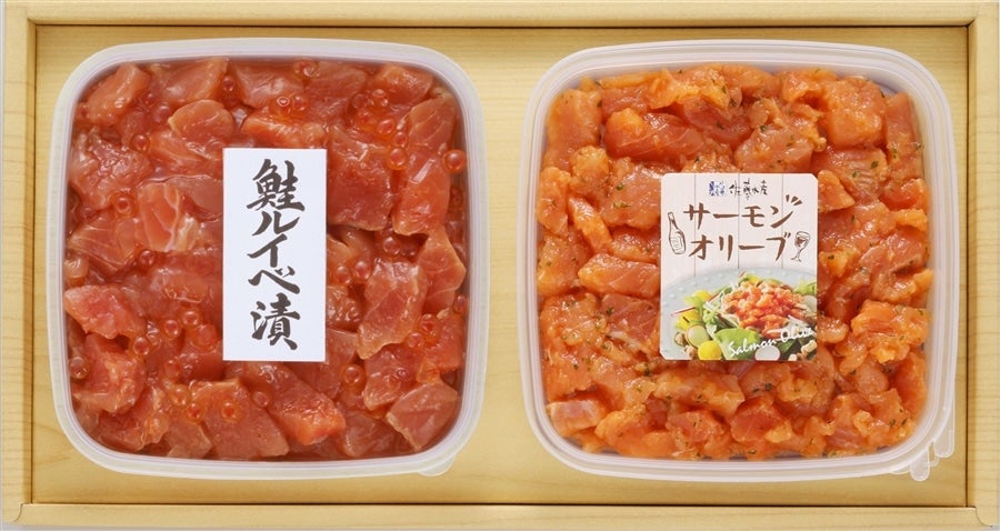 鮭ルイベ漬160g、サーモンオリーブ180gの1パックずつを冷凍でお届け。化粧箱でのお届けなので、ギフトにもぴったりです。