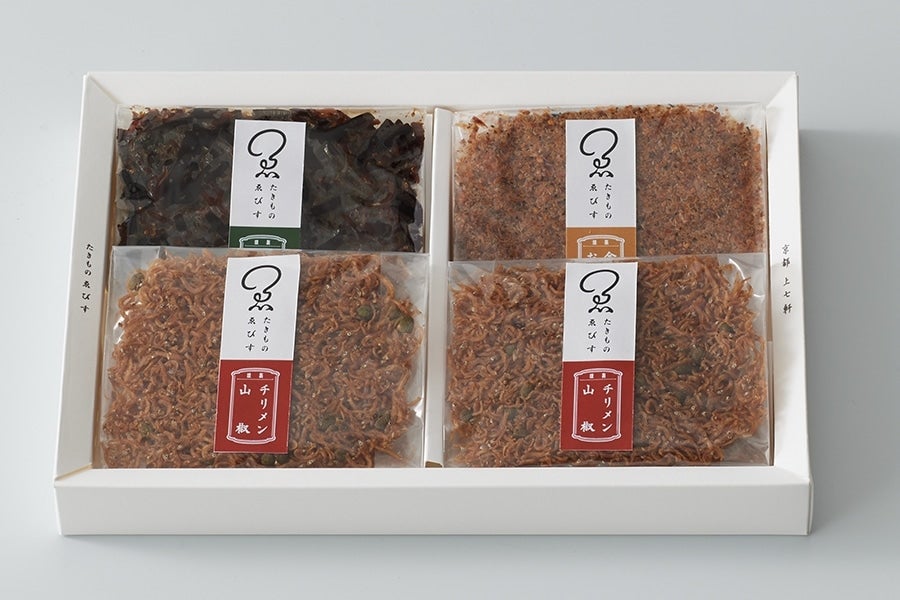 チリメン山椒を2個、金ごまおかか と おこぶ山椒 を各1個ずつ、4個セットでお届けします。おしゃれで上品な化粧箱なので、贈り物にもおすすめです。