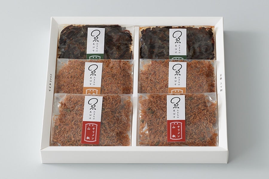 チリメン山椒、金ごまおかか、おこぶ山椒 を各2個ずつ、6個セットでお届けします。おしゃれで上品な化粧箱なので、贈り物にもおすすめです。