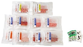 ・めばちまぐろのたたき:めばちまぐろ(日本、台湾、その他)、食用植物油脂/pH調整剤、トレハロース、酸化防止剤(V.C、V.E)