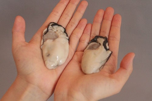 解凍後の写真。Lサイズという規格なので、食べごたえのある大きさですよ! 牡蠣には個体差がありますが、大きめと小さめの粒の差はこのくらい。
