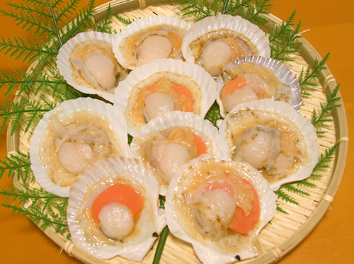写真のように「貝ひも」の周りに付いているオレンジ色の部分はほたての卵巣。ほくほくとしておいしいですよ!
