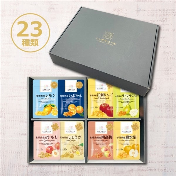 ニッポンエールドライフルーツ全23種類をコンプリートできるセットです。ドライフルーツ好きさんはもちろん、周りとシェアして楽しみたい方にもおすすめです。