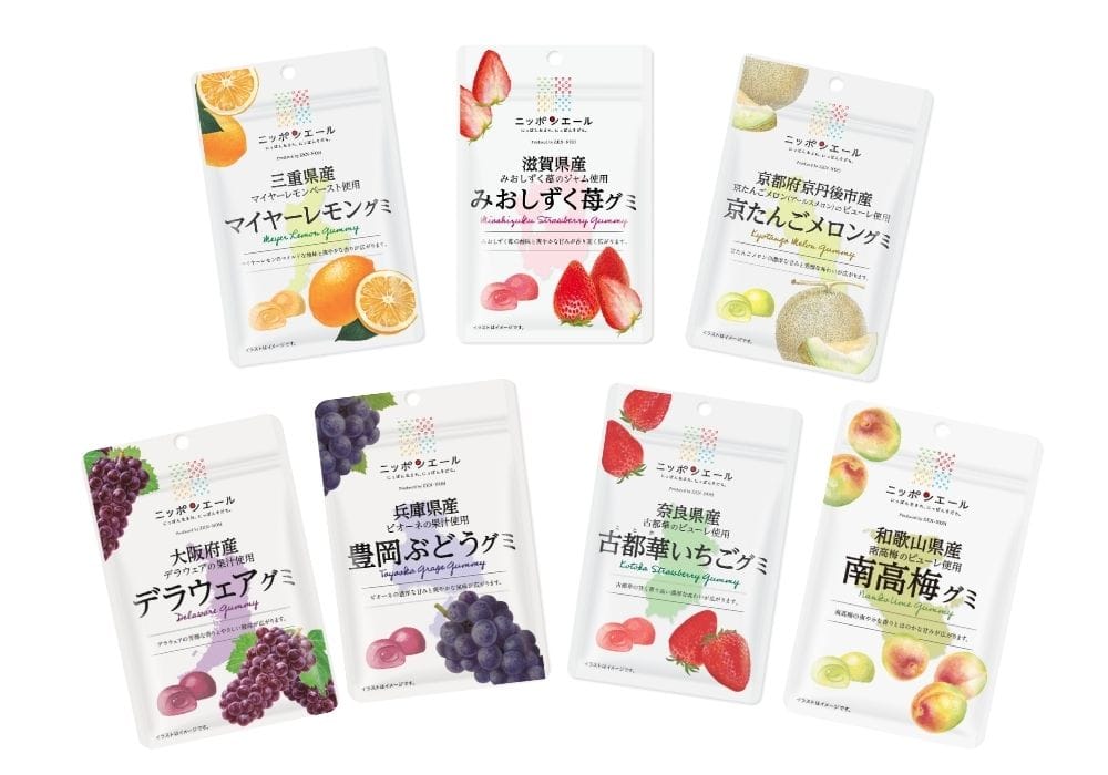 (三重県産マイヤーレモングミ/滋賀県産みおしずく苺グミ/京都府京丹後市産京たんごメロングミ/大阪府産デラウェアグミ/兵庫県産豊岡ぶどうグミ/奈良県産古都華いちごグミ/和歌山県産南高梅グミ)
