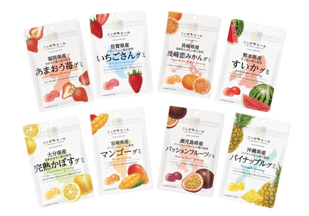 (福岡県産あまおう苺グミ/佐賀県産いちごさんグミ/長崎県産長崎恋みかんグミ/熊本県産すいかグミ/大分県産完熟かぼすグミ/宮崎県産マンゴーグミ/鹿児島県産パッションフルーツグミ/沖縄県産パイナップルグミ)