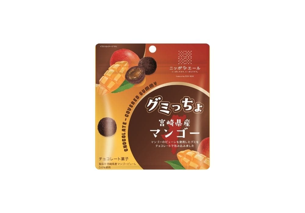 【原材料】チョコレート(砂糖、カカオマス、植物油脂、ココアパウダー、ココアバター)(国内製造)、グミ(砂糖、水あめ、還元水あめ、マンゴーピューレ(マンゴー(宮崎県産))、粉末オブラート)(国内製造)、ココアパウダー/ゲル化剤(ペクチン)、酸味料、乳化剤、光沢剤、香料、カロテン色素、(一部に乳成分・大豆を含む)