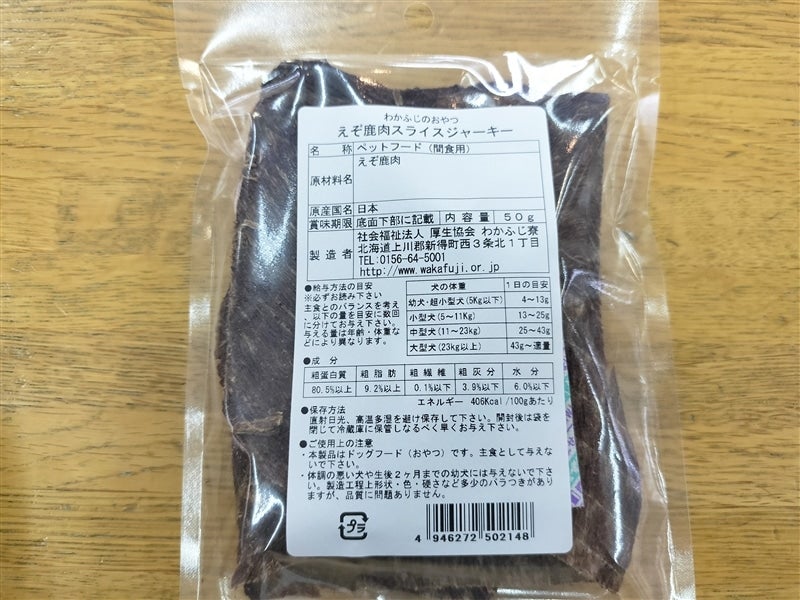 【商品詳細】 ・えぞ鹿肉スライスジャーキー50g×5袋 ・北海道新得町にある障害者支援施設「わかふじ寮」で心を込めて作った、ワンちゃんの間食用ジャーキーです。 ・スライスジャーキーは保存料や発色剤などを使用せずに乾燥しました。 ・体調の悪い犬や生後2ヶ月までの幼犬には与えないでください。