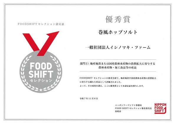石巻の街中からは車でおよそ50分、牡鹿半島の先端部に位置する鮎川浜(あゆかわはま)はクジラの町としても有名で、海にまつわる産業がとても盛んです。「金華塩」をつくっているのは、社会福祉法人石巻祥心会「くじらのしっぽ」さん。海の近くののどかな場所で、地域の福祉事業をされています。 海水を釜で10日ほど煮詰め、約7日間干し、その後不純物を取り除き、「金華塩」ができあがります。じっくり時間をかけて地域の多様な方々とともに塩づくりをしています。牡鹿半島の海域は、金華山沖で黒潮と親潮が合流し、ミネラルの豊富な山からの伏流水も注ぎ込んでいるため、塩には深みや、ほのかな甘さも感じられます。 宮城県石巻市で栽培された「ホップ」と、石巻市牡鹿半島の「天然塩」をハーブとミックスさせた調味料をビールの原料であるホップの独特の香りや苦味を、お楽しみください。 この度、NIPPON FOOD セレクション2025において、イシノマキファームが農福連携及びソーシャルファームの一環で製造販売している「巻風ホップソルト」が優秀賞を受賞いたしました。