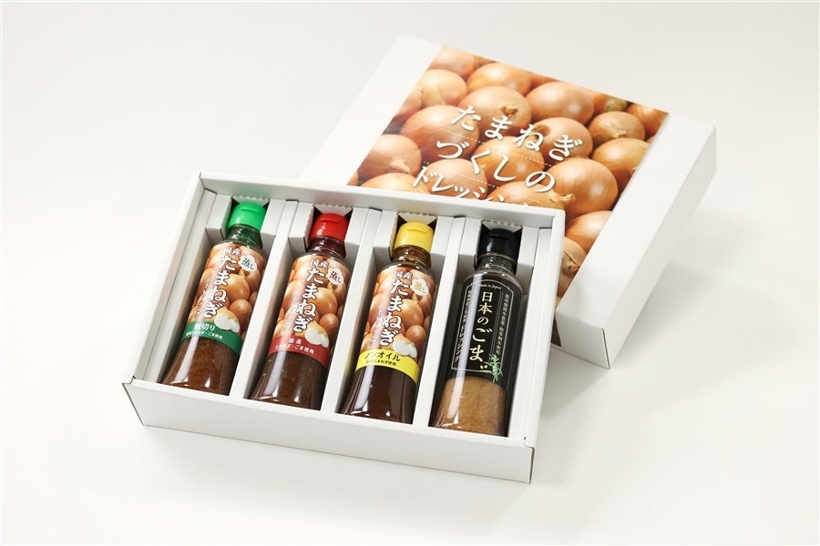 自社農園で栽培した、たまねぎ、ごま、にんにくを主原料に製造したこだわりのドレッシングです。 たまねぎの食感が楽しめる「国産蒸したまねぎドレッシング粗切り」×1本 ベーシックドレッシングの「国産蒸したまねぎドレッシング」×1本 カロリー控えめ「国産蒸したまねぎドレッシングノンオイル」×1本 国産ごまたっぷりの「日本のごまドレッシング」×1本 各々食卓メニューに合わせてご使用いただけます。