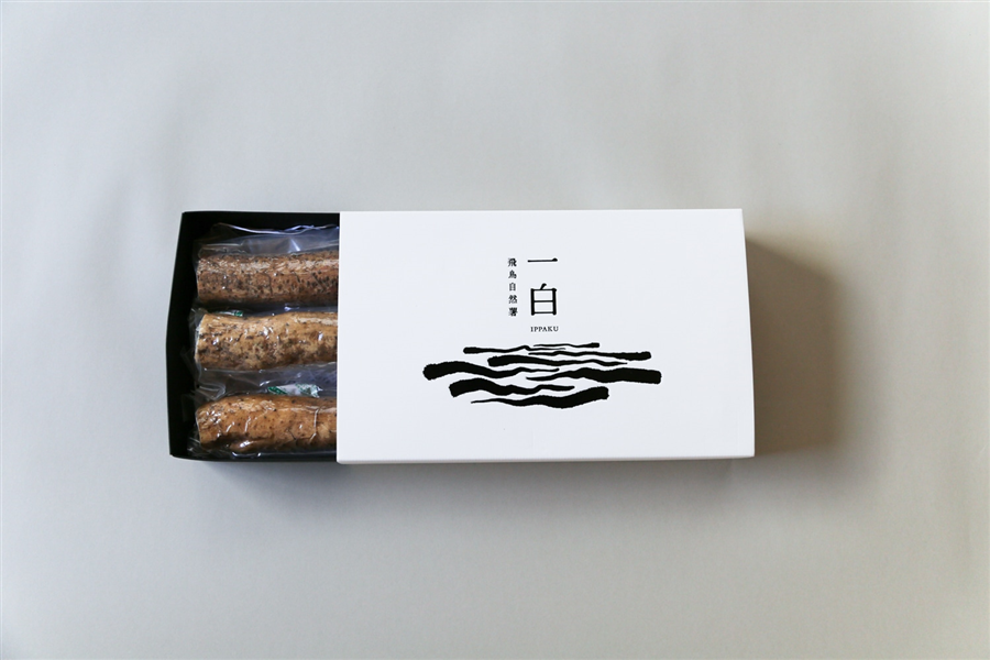 『飛鳥自然薯 一白』を使いやすいようにカットし、1本ずつ真空パックに包装し、3本で合計500gをギフトボックスに梱包しました。