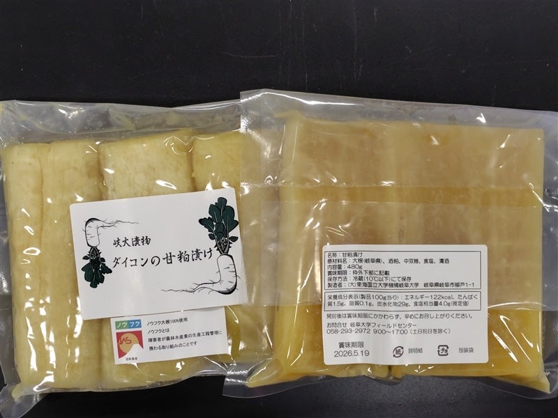 岐阜大学農場産ノウフク大根使用。学生や障がい者雇用の職員が育てた大根をやさしい甘粕で漬け込みました。
